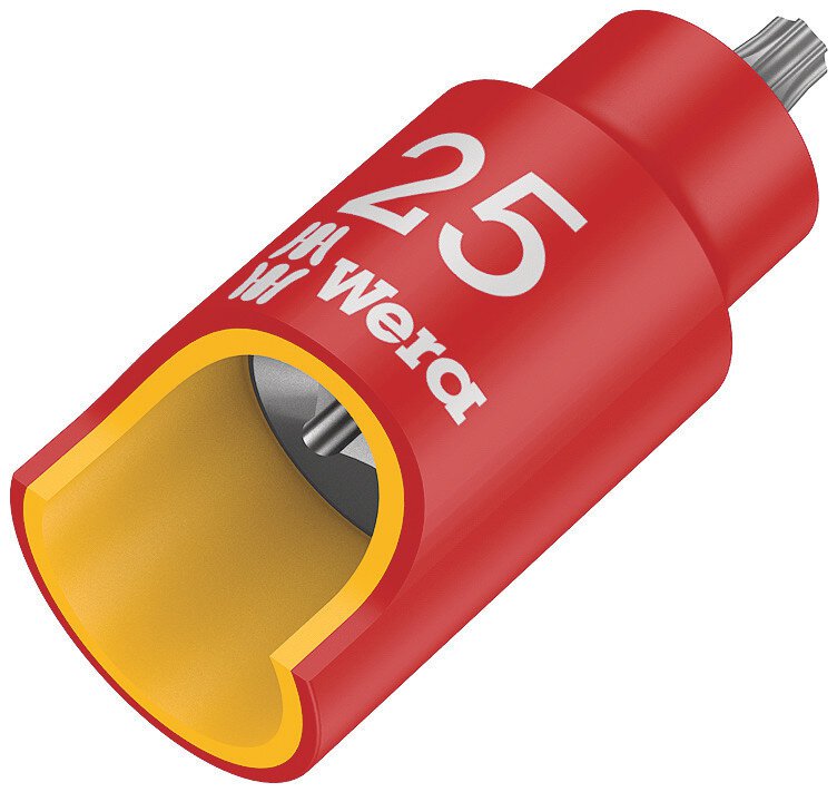 VDE 3/8" Bitnuss mit Haltefunktion für besonders komfortables Schrauben mit reduzierter Gefahr des Schraubenverlustes beim Zuführen zum Werkstück. Mit erhöhter Sicherheit durch gelben Isolationskern, der bei einer eventuellen Beschädigung der äußeren roten VDE Isolationsschicht sichtbar wird. Stückgeprüftes Werkzeug gem. IEC 60900 bei 10.000 V für sicheres Arbeiten bei der zugelassenen Spannung von 1.000 V.