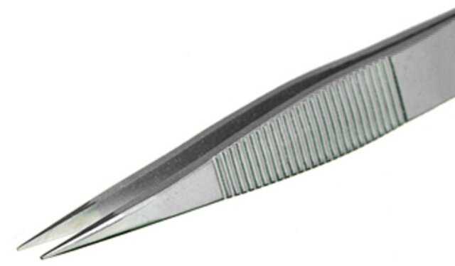 Präzisionspinzette mit flachen abgerundeten Spitzen zum Greifen kleiner Komponenten.