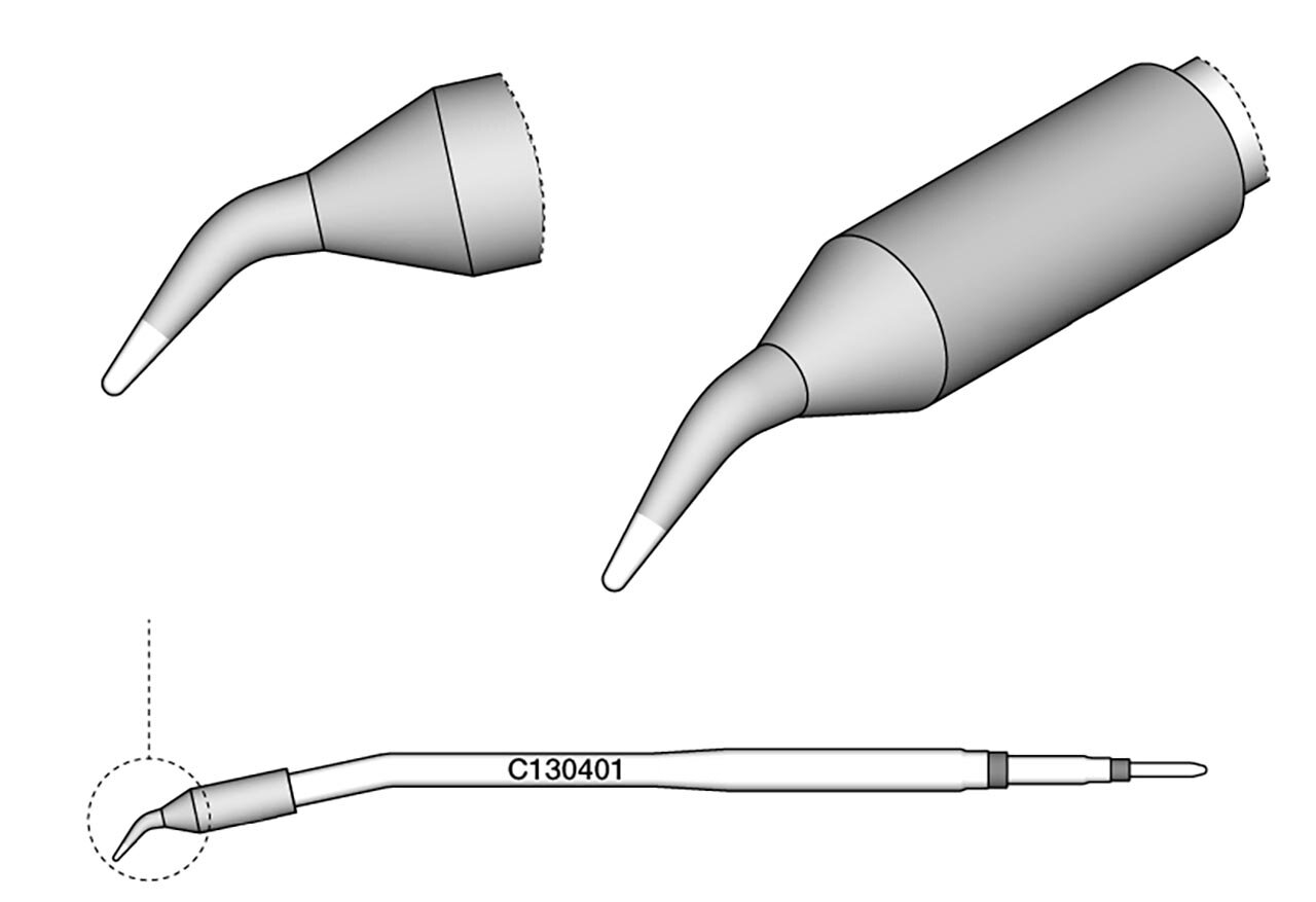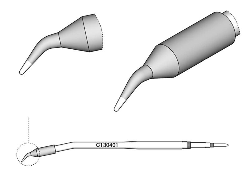 Die Löspitzenserie C130 sind für das Handstück AP130 geeignet und verfügen über gebogene Spitzen, die perfekt an die die Position des Zinndrahts angepasst sind. Die Spitzen können mit Hilfe der Verdrehsicherung am Handstück ausgerichtet werden.