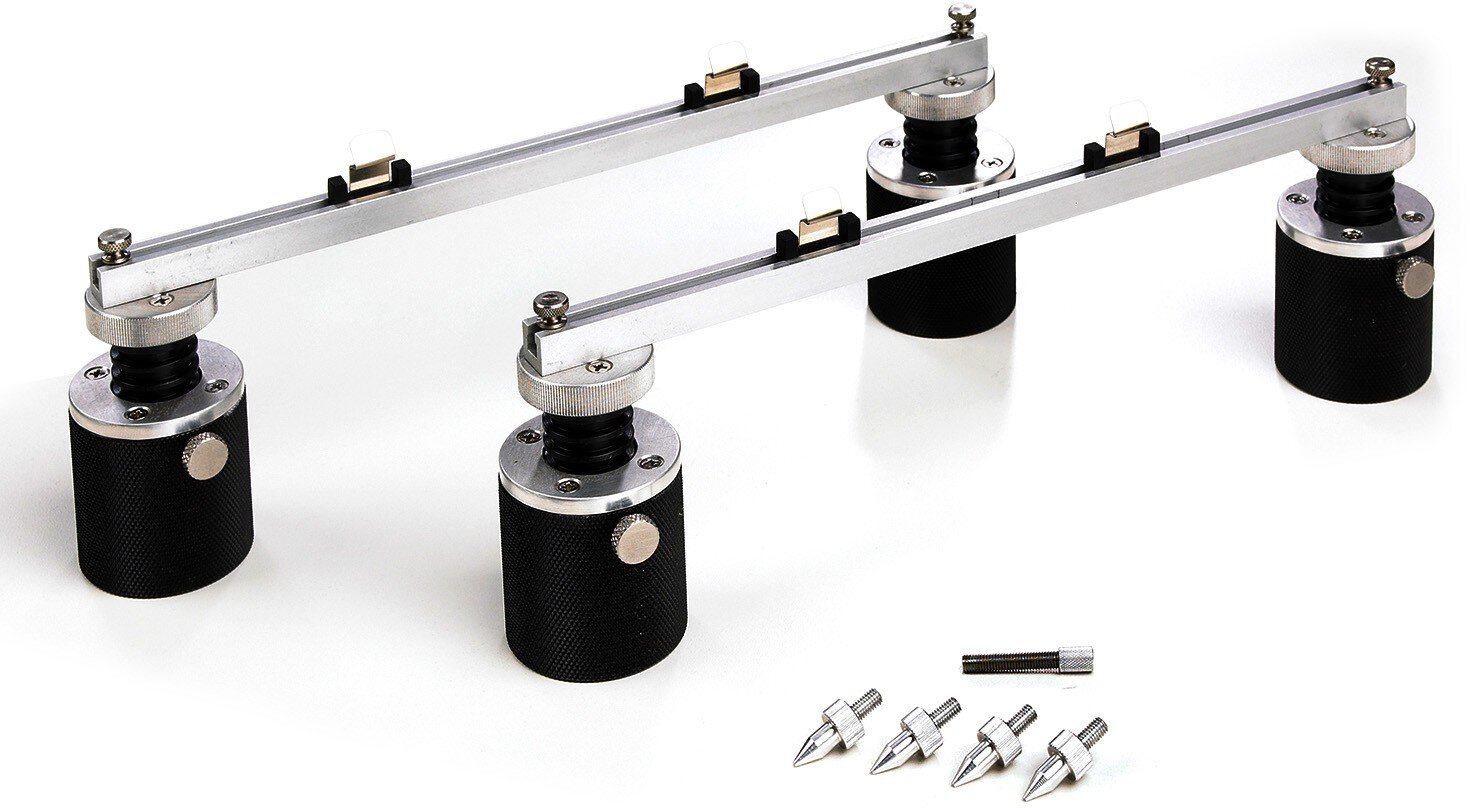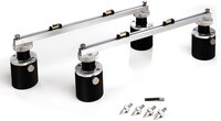 Der Plattenhalter besteht aus (4) Pfosten, (2) Schienen mit verschiebbaren Clips, (4) Stützstiften und Flachkopfstützen.