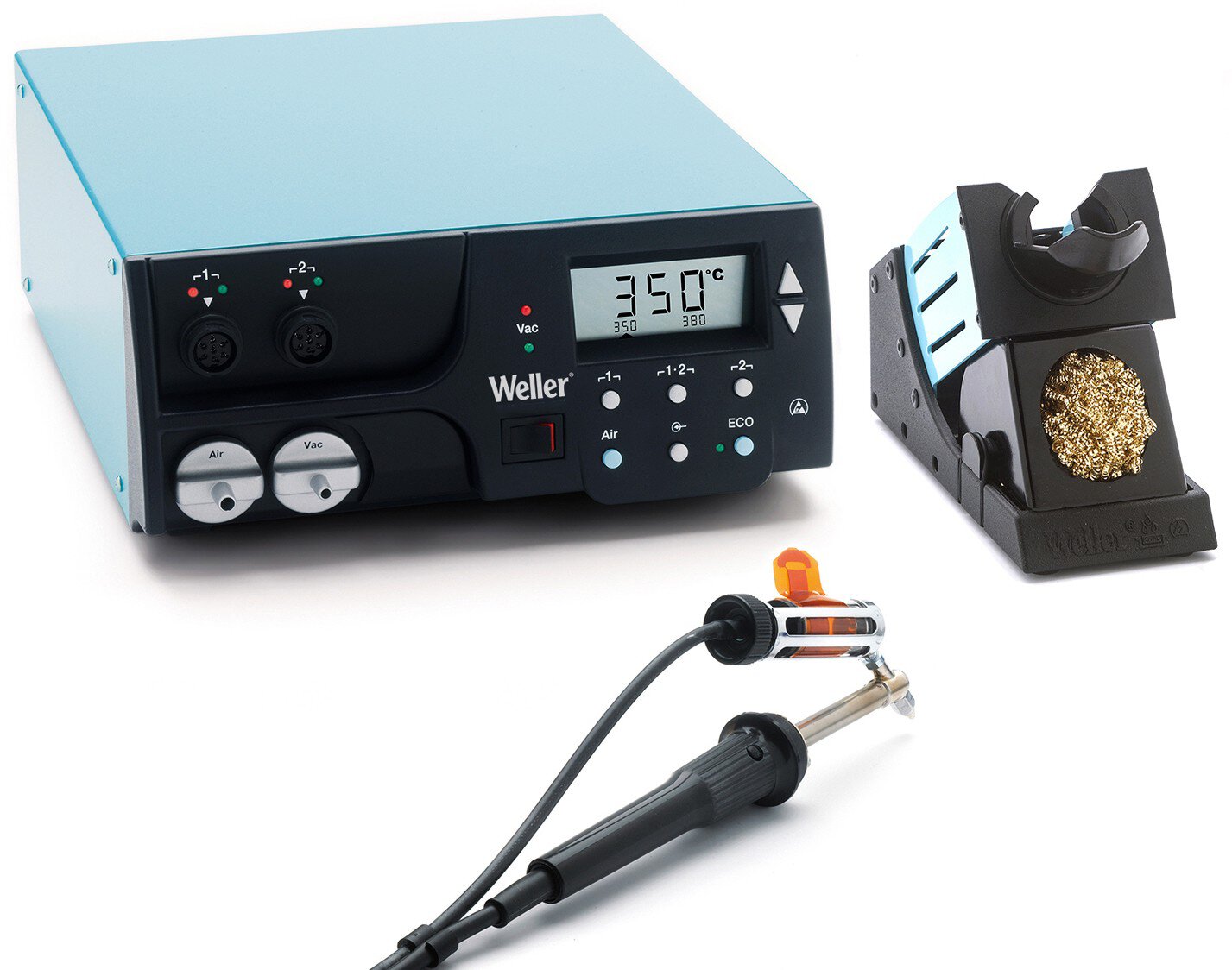 Die Weller Reparaturstation WR 2 ist eine vielseitig verwendbare Löt- und Entlötstation für professionelle Reparaturarbeiten an elektronischen Baugruppen neuester Technologie in der industriellen Fertigungstechnik sowie im Reparatur- und Laborbereich. Die WR2 verfügt über zwei unabhängige werkzeugspezifische Kanäle mit automatischer Werkzeugerkennung und Aktivierung. Gleichzeitiges Löten und Entlöten oder Löten und Heißluftlöten ist damit jederzeit möglich. An der Reparaturstation können - mit Ausnahme der Weller High-Speed Tools - alle Lötwerkzeuge wie Lötkolben, Lötbäder, Entlötkolben oder Heißluftkolben betrieben werden.