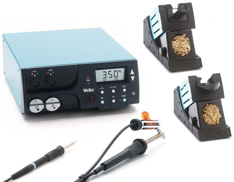 Die Weller Reparaturstation WR 2 ist eine vielseitig verwendbare Löt- und Entlötstation für professionelle Reparaturarbeiten an elektronischen Baugruppen neuester Technologie in der industriellen Fertigungstechnik sowie im Reparatur- und Laborbereich. Die WR 2 verfügt über zwei unabhängige werkzeugspezifische Kanäle mit automatischer Werkzeugerkennung und Aktivierung. Gleichzeitiges Löten und Entlöten oder Löten und Heißluftlöten ist damit jederzeit möglich. An der Reparaturstation können - mit Ausnahme der Weller High-Speed Tools - alle Lötwerkzeuge wie Lötkolben, Lötbäder, Entlötkolben oder Heißluftkolben betrieben werden.