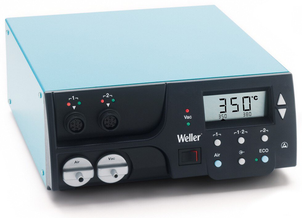 Die Weller Reparaturstation WR 2 ist eine vielseitig verwendbare Löt- und Entlötstation für professionelle Reparaturarbeiten an elektronischen Baugruppen neuester Technologie in der industriellen Fertigungstechnik sowie im Reparatur- und Laborbereich. Die WR2 verfügt über zwei unabhängige werkzeugspezifische Kanäle mit automatischer Werkzeugerkennung und Aktivierung. Gleichzeitiges Löten und Entlöten oder Löten und Heißluftlöten ist damit jederzeit möglich. An der Reparaturstation können - mit Ausnahme der Weller High-Speed Tools - alle Lötwerkzeuge wie Lötkolben, Lötbäder, Entlötkolben oder Heißluftkolben betrieben werden.