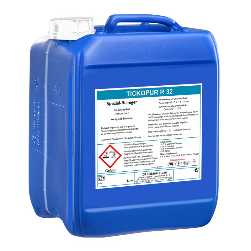 TICKOPUR R 32 ist speziell für die Reinigung in SONOREX-Ultraschallgeräten, aber auch zur Tauch-, Wisch- und Hochdruckreinigung einzusetzen.