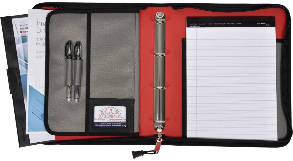 • praktische Aufteilung im Innenbereich mit Halterung für A4-Block, mehreren Taschen für Visitenkarten und doppelter Stifthalterung