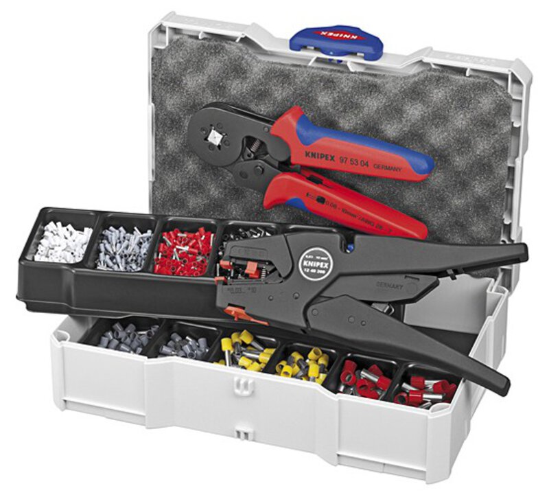 Im TANOS MINI-systainer® (stabile Kunststoffbox). T-Loc-Verschluss für Einhandbedienung: mit einem Dreh den systainer® öffnen oder schließen und mit einem zweiten systainer® verbinden.. Öffnen im verknüpften Zustand: Einfach und schnell auf die Inhalte zugreifen, ohne die Verbindung zu lösen.. Zwei stapelbare Kunststoffeinsätze mit je sechs Mulden für Verbinder. Mit einem Sortiment Aderendhülsen mit / ohne Kunststoffkragen. mit selbsteinstellender Abisolierzange 12 40 200. mit selbsteinstellender Crimpzange für Aderendhülsen 97 53 04. Lieferumfang: 1 x 12 40 200 KNIPEX Selbsteinstellende Abisolierzange (0,03 – 10,0 mm²), 1 x 97 53 04 KNIPEX Selbsteinstellende Crimpzange für Aderendhülsen mit Seiteneinführung (0,08 – 10 + 16 mm²), 200 x KNIPEX Aderendhülsen mit Kunststoffkragen 22 / 12 mm (10 mm²), 200 x KNIPEX Aderendhülsen mit Kunststoffkragen 20 / 12 mm (6 mm²), 200 x KNIPEX Aderendhülsen mit Kunststoffkragen 17 / 10 mm (4 mm²), 200 x KNIPEX Aderendhülsen mit Kunststoffkragen 14 / 8 mm (2,5 mm²), 200 x KNIPEX Aderendhülsen mit Kunststoffkragen 14 / 8 mm (1,5 mm²), 100 x KNIPEX Aderendhülsen mit Kunststoffkragen 14 / 8 mm (1 mm²), 100 x KNIPEX Aderendhülsen mit Kunststoffkragen 14 / 8 mm (0,75 mm²), 50 x KNIPEX Aderendhülsen mit Kunststoffkragen 14 / 8 mm (0,5 mm²),