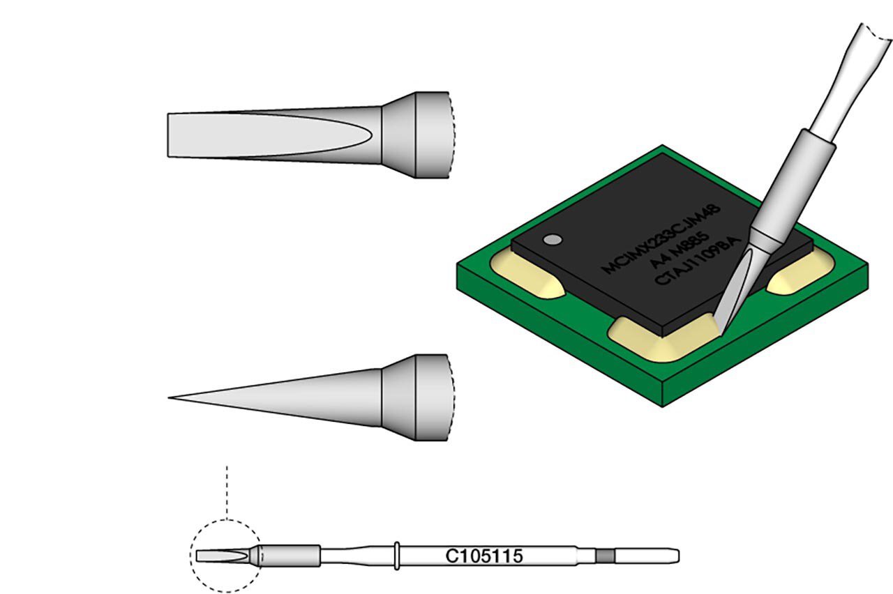 Die Lötspitzen der Serie C105 sind die kleinsten Spitzen der JBC-Serien und eignen sich hervorragend zum Löten und Reparieren sehr kleiner Bauteile. Diese sind kompatibel mit den NT105 und NP105 Nanohandstücken