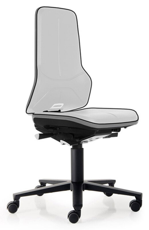 Ausgestattet mit fünf volumenleitfähigen Rollen ist der ESD Stuhl Neon 2 für den flexiblen Einsatz am Arbeitsplatz bestens geeignet. Außerdem lässt sich der Arbeitsstuhl mit der Synchron-Rückenlehne in Kombination mit dem Ergonomiepaket optimal an den jeweiligen Benutzer anpassen.