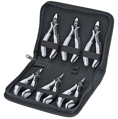 Abmessungen, geschlossen (B x H x T): 215 x 160 x 50 mm. 6-teilig, bestückt mit sechs Präzisions-Elektronikzangen Ausführung ESD, elektrisch ableitend. Etui aus strapazierfähigem Polyester-Gewebe, Zangenhalterung aus elastischem Gummiband, Reißverschluss. Lieferumfang: 1 x 34 12 130 ESD KNIPEX Präzisions-Elektronik-Greifzange ESD, 1 x 34 22 130 ESD KNIPEX Präzisions-Elektronik-Greifzange ESD, 1 x 34 32 130 ESD KNIPEX Präzisions-Elektronik-Greifzange ESD, 1 x 79 02 120 ESD KNIPEX Präzisions-Elektronik-Seitenschneider ESD (Für feinste Schneidarbeiten), 1 x 79 02 125 ESD KNIPEX Präzisions-Elektronik-Seitenschneider ESD (Für feinste Schneidarbeiten), 1 x 79 42 125 ESD KNIPEX Präzisions-Elektronik-Seitenschneider ESD (Für feinste Schneidarbeiten),