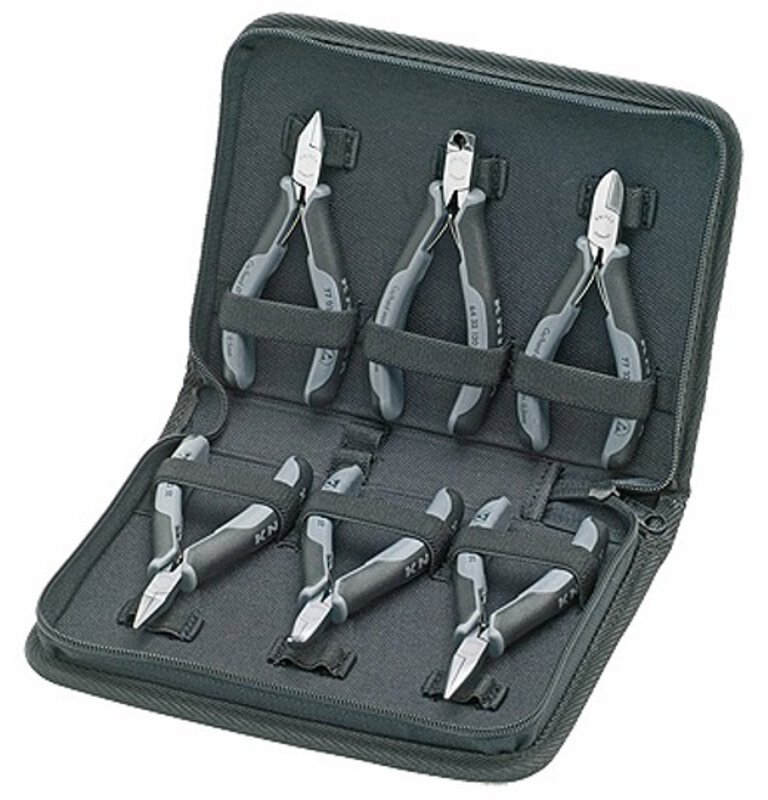 Abmessungen, geschlossen (B x H x T): 215 x 160 x 50 mm. 6-teilig, bestückt mit sechs Elektronikzangen Ausführung ESD, elektrisch ableitend. Etui aus strapazierfähigem Polyester-Gewebe, Zangenhalterung aus elastischem Gummiband, Reißverschluss.