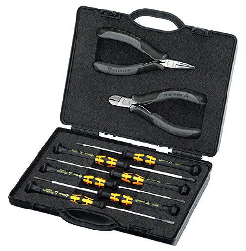 Abmessungen, geschlossen (B x H x T): 215 x 160 x 50 mm. 8-teilig, bestückt mit zwei Elektronikzangen und sechs Elektronik-Schraubendrehern Ausführung ESD, elektrisch ableitend. praktische Aufbewahrungs-Box, aus schlagfestem Kunststoff, mit Schaumstoffeinlagen. Lieferumfang: 1 x 35 22 115 ESD KNIPEX Elektronik-Greifzange ESD, 1 x 77 02 115 ESD KNIPEX Elektronik-Seitenschneider ESD (Für feinste Schneidarbeiten), 1 x 30104 Wera Schraubendreher für Schlitzschrauben 1578 A (0,4 x 2,5 x 80 mm), 1 x 30105 Wera Schraubendreher für Schlitzschrauben 1578 A (0,5 x 3,0 x 80 mm), 1 x 30106 Wera Schraubendreher für Schlitzschrauben 1578 A (0,6 x 3,5 x 80 mm), 1 x 30107 Wera Schraubendreher für Schlitzschrauben 1578 A (0,8 x 4,0 x 80 mm), 1 x 30111 Wera Schraubendreher, Kreuzschlitz Phillips® 1550 PH (PH0 x 60mm), 1 x 30112 Wera Schraubendreher, Kreuzschlitz Phillips® 1550 PH (PH1 x 80 mm),