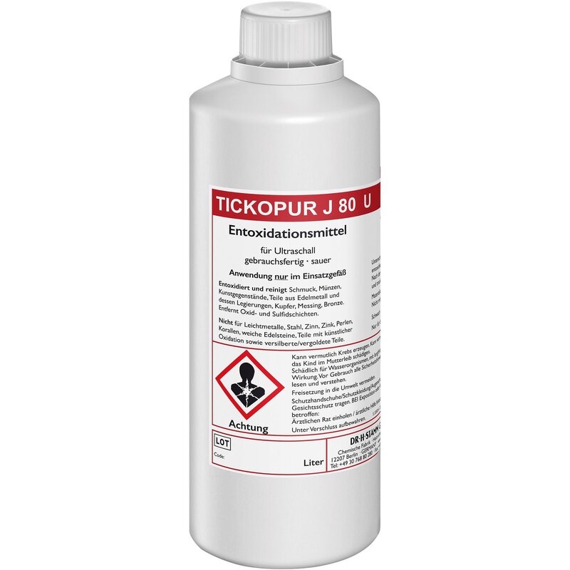 TICKOPUR J 80 U zur Entoxidation und Reinigung von Bunt- und Edelmetallen in Handwerk, Industrie und Laboratorien. Bei sachgemäßer Anwendung wird eine schnelle und materialschonende Entoxidation und Reinigung gewährleistet.