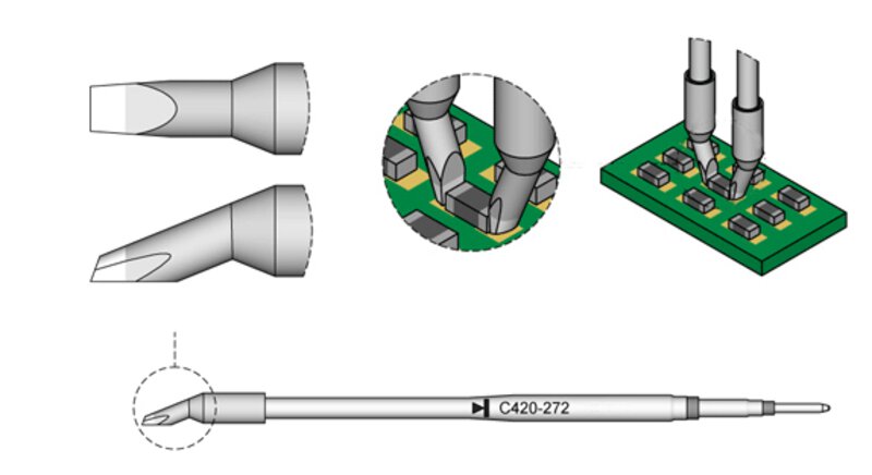 Die Spitzenserie C420 eignen sich zum Löten und Entlöten von SMD-Bauteilen. Die Lötspitzen sind kompatibel mit der Thermopinzette HT420 und werden einzeln verkauft.