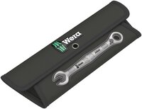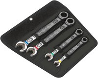 Hochwertiger Ringratschen-Maulschlüssel-Satz von Wera: Alles, was ein Schlüssel können muss. Und noch viel mehr. Schneller, besser, schöner. Eben ein echter Joker. Die neue Generation der Maul-Ringratschen-Schlüssel. 4-teiliger Satz in robuster Tasche. Für Sechskant-Schraubenköpfe bzw. -Muttern. Mit Haltefunktion durch Metallplatte im Maul, die die Gefahr des Verlierens von Schrauben und Muttern reduziert. Die auswechselbare Metallplatte im Maul sichert mit extra harten Zähnen Schrauben und Muttern und reduziert die Abrutschgefahr. Der integrierte Endanschlag kann das Abrutschen vom Schraubenkopf nach unten verhindern und ermöglicht das Aufbringen hoher Drehmomente. Die Doppelsechskantgeometrie sorgt für die formschlüssige Verbindung mit Schraube oder Mutter und damit für die Verringerung der Abrutschgefahr. Ein Rückschwenkwinkel von nur 30° auf der Maulseite vermeidet zeitintensives Wenden des Schlüssels beim Schrauben. Ratschenmechanik auf der Ringseite mit außergewöhnlich hoher Feinverzahnung von 80 Zähnen für Flexibilität auch in engen Bauräumen. Die spezielle Schmiedegeometrie sorgt für hohe Drehmomentübertragung und hohe Biegungssteifigkeit. Gefertigt aus leistungsfähigem Chrom-Molybdän-Stahl mit Nickel-Chrom Beschichtung für hohen Korrosionsschutz. Mit Werkzeugfinder Take it easy: Farbkennzeichnung nach Größen.