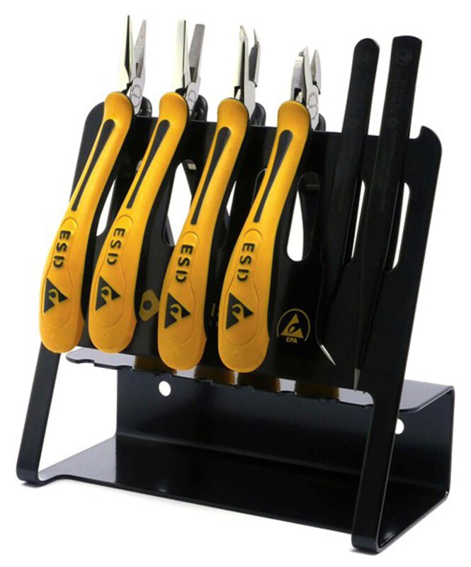 | Lieferumfang | 6-tlg. ESD Werkzeugsatz bestehend aus: 3-601-15 Seitenschneider CLASSICline, 115 mm, mit abgerundetem Zangenkopf, Semi Flush, ableitfähige, zweifarbige Handschutzhüllen 3-606-15 Spitzenschneider CLASSICline, 120 mm, mit winklig abgebogener Spitze 30° Flush, ableitfähige, zweifarbige Handschutzhüllen 3-632-15 Flachzange CLASSICline, 120 mm, mit kurzen Backen, ableitfähige, zweifarbige Handschutzhüllen 3-633-15 Spitzzange CLASSICline, 120 mm,mit kurzen Backen, ableitfähige, zweifarbige Handschutzhüllen 5-078-13 SMD-Pinzette, 127 mm, verjüngend, 1,0 mm breit, mit ESD-Beschichtung 5-055-13 SMD-Pinzette, 120 mm, sichelförmig, super-spitz, mit ESD-Beschichtung 5-090-0 ESD Werkzeughalter VARIO |