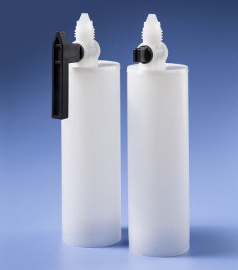 Die 380ml-Koaxialkartusche hat ein zylindrisches Innenund Außenrohr für je ein Material im Mischverhältnis 10:1. Die Kartusche wird mit einem bereits integriertem Drehverschluss geliefert, der die Kartusche öffnet und wieder verschließt. Ein zusätzlicher Steck- oder Schraubverschluss ist nicht notwendig.
