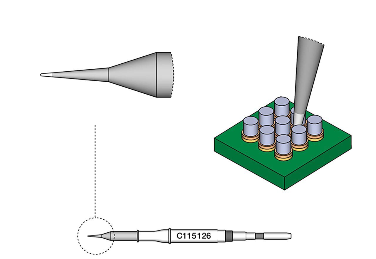 Die Lötspitzen der Serie C115 eignen sich zum Löten und Reparieren sehr kleiner Bauteile. Diese sind kompatibel mit NT115-A, NP115-A und AN115-A Nano Löthandstücken.