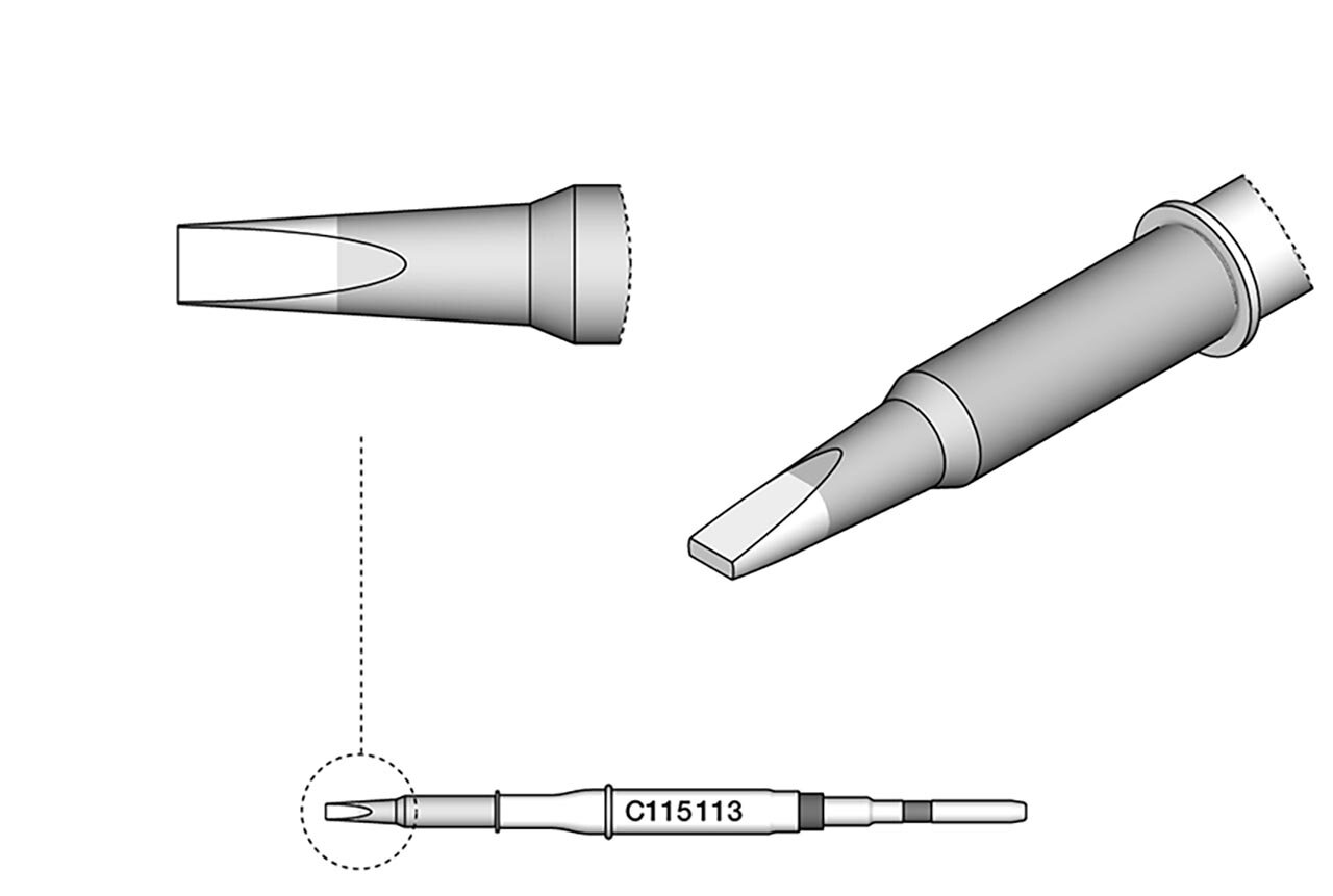 Mit einem Gewicht von lediglich 1g und kompakten Abmessungen ist die C115113 besonders handlich und ermöglicht präzises Arbeiten auch auf engstem Raum. Die Meißelform der Spitze erlaubt sowohl das punktgenaue Löten als auch das Bearbeiten größerer Flächen, was sie vielseitig einsetzbar macht.
