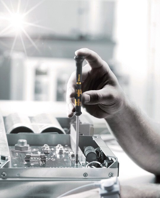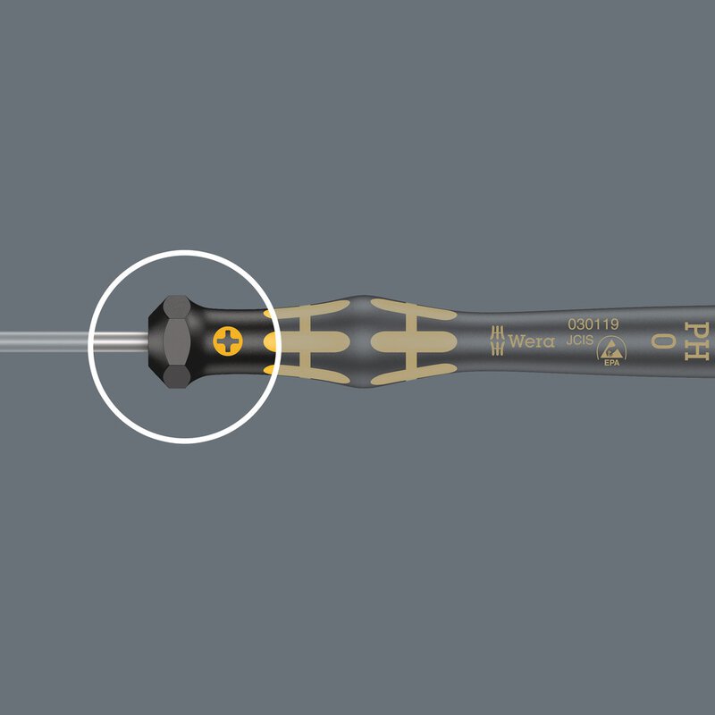 Elektrostatisch abgesicherter Wera Micro Schraubendrehersatz. Sicherer Schutz vor elektrostatischer Energie und damit verbundenen Schäden. Durch Abstützen der Hand auf der Drehkappe und durch die Schnelldrehzone unterhalb der Drehkappe ist blitzschnelles Zwirbeln möglich. Zeitintensives Umgreifen entfällt. Kraftzone mit integrierten Weichzonen sorgt für die Übertragung hoher Löse- und Anzugsmomente. Präzisionszone für den richtigen Drehwinkel bei Justierarbeiten. Die Wera Black Point-Spitze bietet Passgenauigkeit und optimierten Korrosionsschutz.