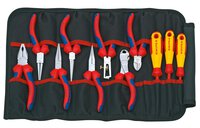 Für Fernmelde- und Elektrotechniker. Rolltasche aus strapazierfähigem Polyester-Gewebe. Mit praktischem, verstellbarem Schnellverschluss. Bestückt mit acht Zangen und drei Schraubendrehern. Zangen mit verchromten Köpfen und zweifarbigen Mehrkomponenten-Hüllen. Schraubendreher VDE-geprüft nach DIN EN 60900 1000V. Abmessungen, geöffnet (L x H ): 450 x 290 mm. Lieferumfang: 1 x 11 05 160 KNIPEX Abisolierzange mit Öffnungsfeder, universal (Ø 5,0 mm / 10,0 mm²), 1 x 03 05 160 KNIPEX Kombizange (Für Flach- und Rundmaterial), 1 x 25 05 160 KNIPEX Flachrundzange mit Schneide (Radiozange) (Für feines greifen und schneiden), 1 x 98 24 01 KNIPEX Schraubendreher für Kreuzschlitzschrauben Phillips® (PH1), 1 x 98 20 25 KNIPEX Schraubendreher für Schlitzschrauben (2,5 mm), 1 x 98 20 40 KNIPEX Schraubendreher für Schlitzschrauben (4,0 mm), 1 x 70 05 140 KNIPEX Seitenschneider, 1 x 67 05 140 KNIPEX Kraft-Vornschneider, 1 x 31 15 160 KNIPEX Greifzange (Nadelzange), 1 x 30 15 160 KNIPEX Langbeckzange, 1 x 30 35 160 KNIPEX Langbeckzange,