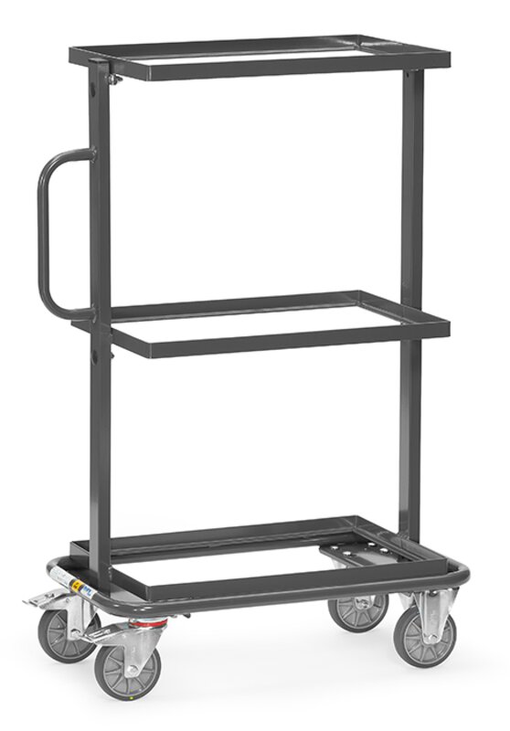 Elektrisch leitfähige Ausführung (ESD = Electrostatic Discharge). Stahlrohr und Profilstahl geschweißt, elektrisch leitfähig, pulverbeschichtet schiefergrau RAL 7015. Böden aus elektrisch leitfähiger Holzwerkstoffplatte nach DIN 68765, hellgrau. TPE-ESD-Bereifung (thermoplastisches Elastomer) elektrisch leitfähig. Naben mit Präzisions-Rillenkugellager. Feststeller an den Lenkrollen, gemäß EN 1757-3 (Sicherheit von Plattformwagen). Stahlrohr- und ProfilstahlKonstruktion. 2 Lenk- und 2 Bockrollen, Feststeller an den Lenkrollen. Tragkraft obere und mittlere Ladefläche 50 kg. Offener Rahmen ohne Platten.