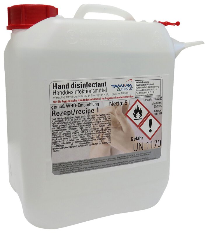 Das Händedesinfektionsmittel von ELSOLD ist mit den hohen Qualitätsstandards der IATF 16949 und jahrzehntelanger Erfahrung bei der Herstellung alkoholhaltiger Produkte in Deutschland gemäß WHO-Empfehlung Rezept 1 für die hygenische Händedesinfektion geeignet. Zur Verwendung die Hände zweimal mit jeweils etwa 3 ml der Lösung einreiben und jeweils 30 Sekunden feucht halten.
