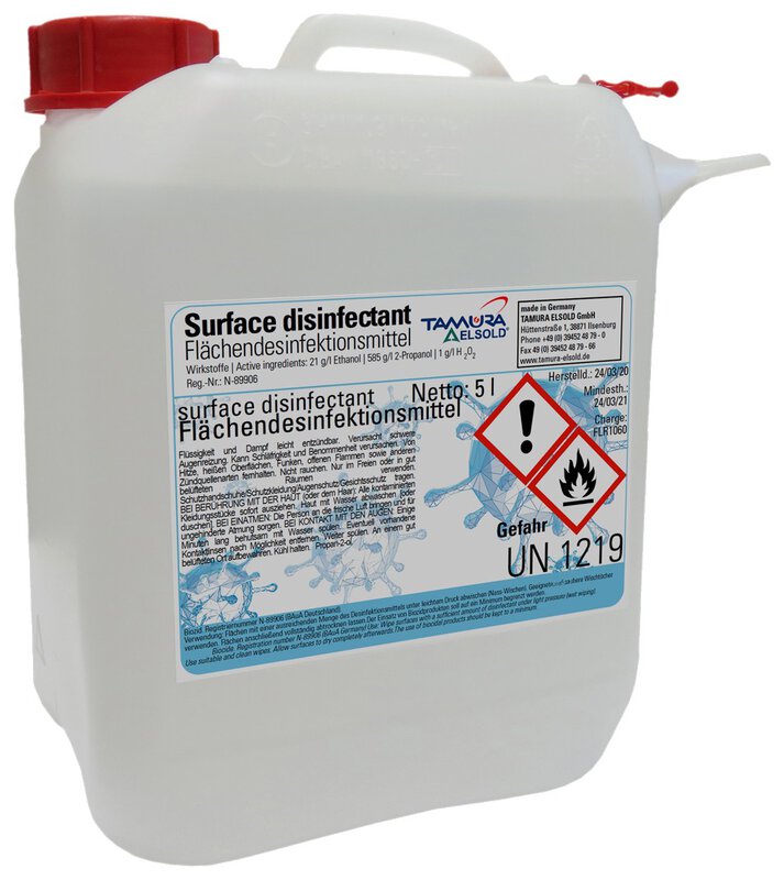 Das Flächendesinfektionsmittel von ELSOLD ist mit den hohen Qualitätsstandards der IATF 16949 und jahrzehntelanger Erfahrung bei der Herstellung alkoholhaltiger Produkte in Deutschland für die hygenische Desinfektion von diversen Flächen geeignet. Flächen mit einer ausreichenden Menge des Desinfektionsmittels unter leichtem Druck abwischen (Nass-Wischen). Geeignete und saubere Wischtücher verwenden. Flächen anschließend vollständig abtrocknen lassen.