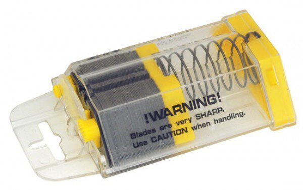 Robuste Klingen werden in einem Klingenspender mit Federspannung geliefert, der für Sicherheit und praktische Aufbewahrung sorgt.