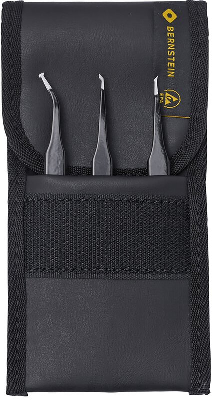 | Lieferumfang | SMD Pinzetten Satz bestehend aus: 5-030-0 ESD ableitfähiges Etui 3 Leerfächer 5-066-13 ESD SMD Pinzette 120mm Form 8b Edelstahl Winkel 30° ableitfähig 5-067-13 ESD SMD Pinzette 120mm Form 12 Edelstahl Winkel 45° ableitfähig 5-068-13 ESD Pinzette 120mm Form 13 Edelstahl Winkel 45° ableitfähig |