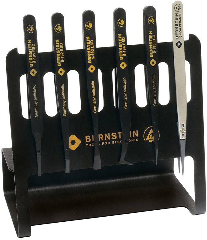 | Lieferumfang | ESD Kunststoff Präzisionspinzetten Satz VARIO bestehend aus: 5-090-0 ESD Werkzeughalter VARIO 8 Langlöcher 5-191 ESD Kunststoff Präzisionspinzette 120mm Form 2a Spitze 2mm breit 5-192 ESD Kunststoff Präzisionspinzette 120mm Form F Spitze 3mm breit 5-193 ESD Kunststoff Präzisionspinzette 120mm Form 35 Spitze 6mm breit 5-194 ESD Kunststoff Präzisionspinzette 120mm Form 6 Hakenspitze 5-195 ESD Kunststoff Präzisionspinzette 120mm Form BB sehr feine Spitze 5-454 ESD Keramik Pinzette mit auswechselbaren Spitzen 0,7mm breit ableitfähig |