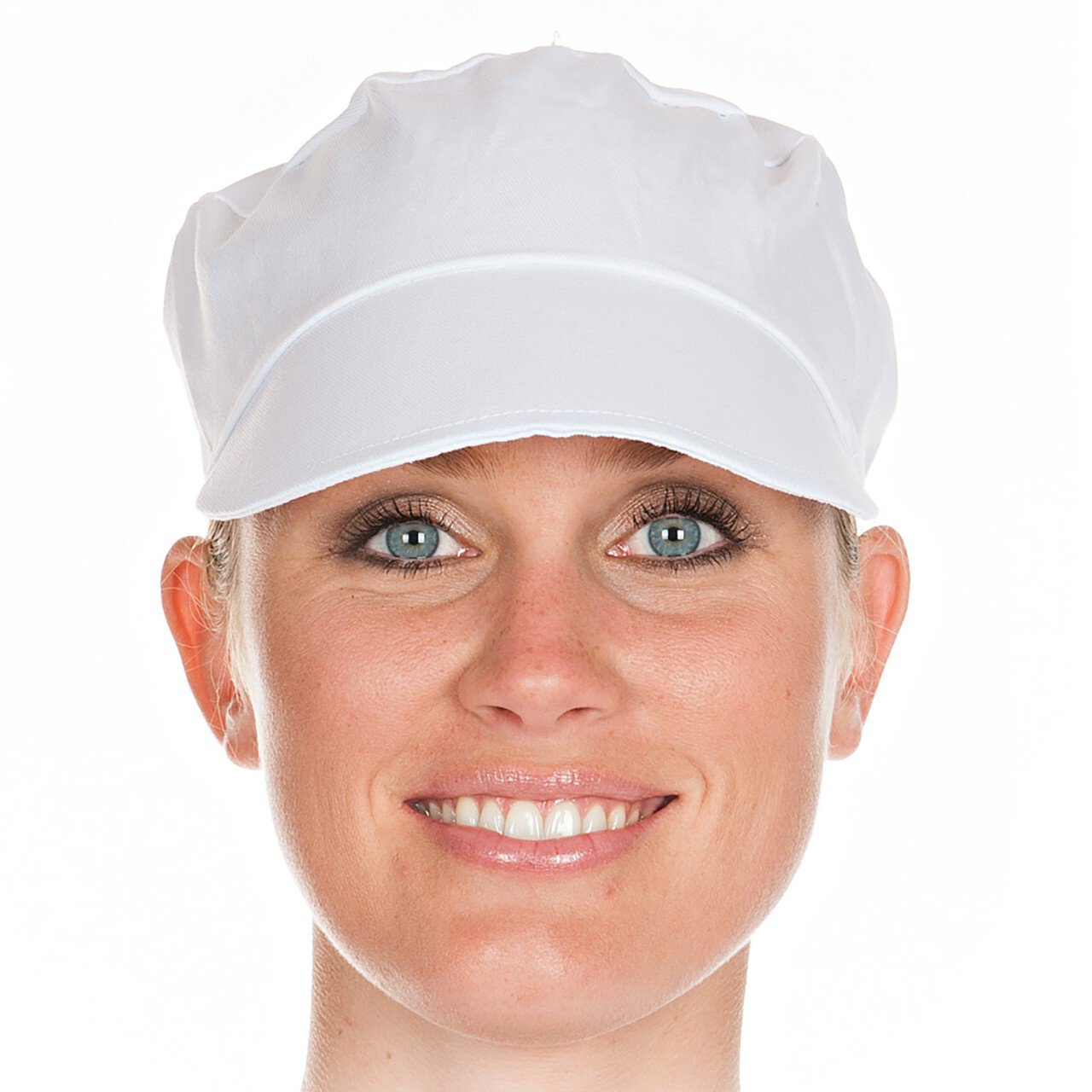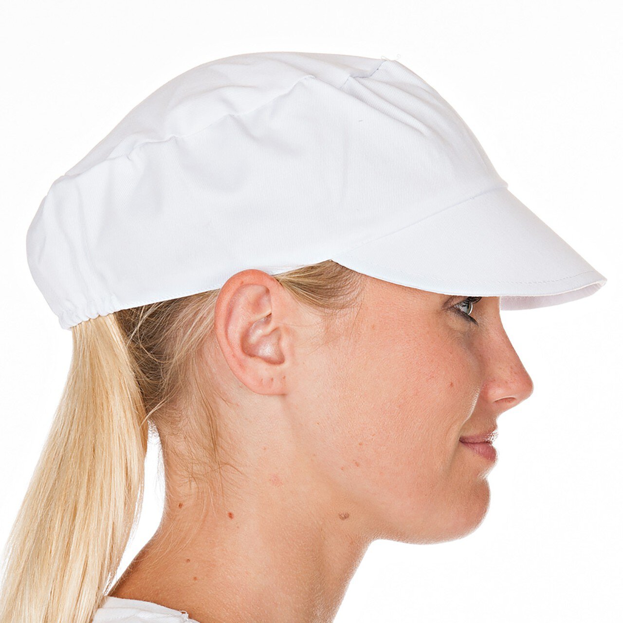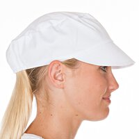 Die Schildmütze ist aus Polycotton, einer Mischung aus Baumwolle und Polyester. Sie ist sehr strapazierfähig, da der Schirm dreifach mit der Mütze vernäht ist. Außerdem ist die Schildmütze bei 60°C (Haushaltswäsche) und 90°C (Industriewäsche) waschbar. Sie eignet sich besonders als Kopfbedeckung in der Lebensmittelindustrie.