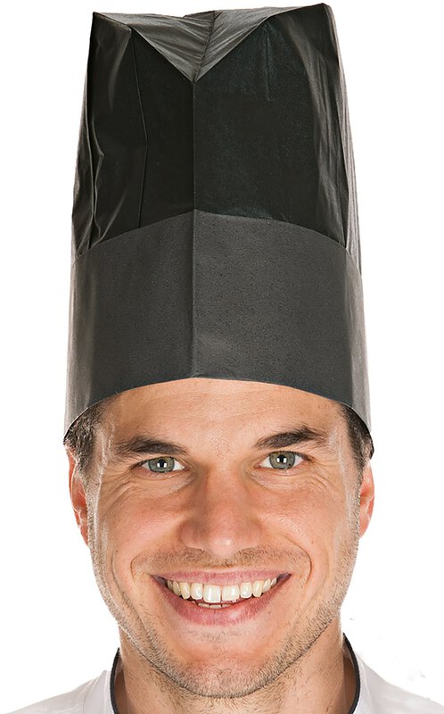 Kochmütze Excellent Black Style Die Kochmütze EXCELLENT BLACK STYLE besteht aus schwarzem Papier in Stoffoptik. Die Mütze ist plissiert und hat ein luftdurchlässiges Oberteil. Sie ist sehr saugfähig und verfügt über ein Schweißband, wodurch es nicht zu einem Abfärben kommt. Die Mütze ist 22 cm hoch und die Kopfweite ist veränderbar.