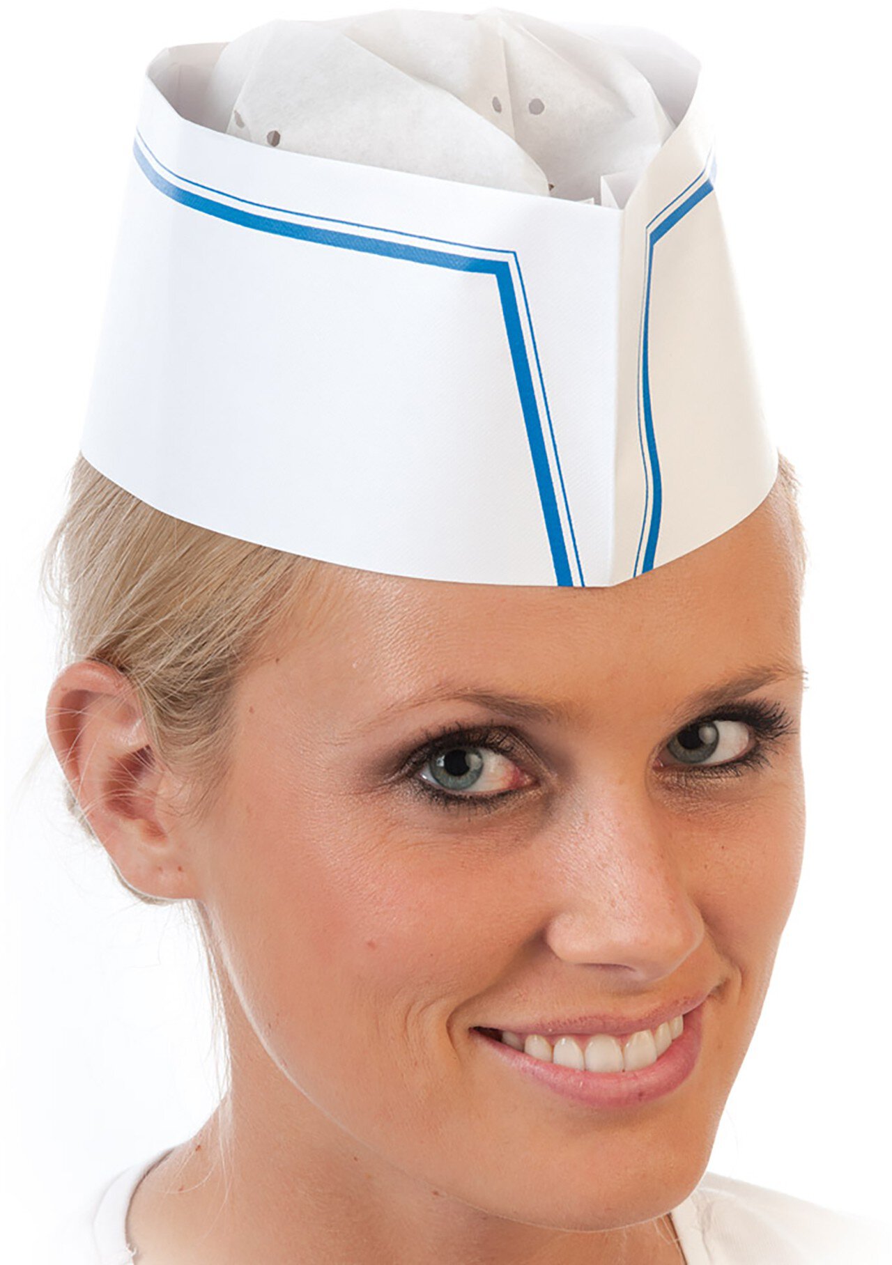 Die Schiffchenmütze SERVICE besteht aus ungeprägtem Papier. Es ist oben mit einem luftdurchlässigen Einsatz verschlossen. Das Schiffchen SERVICE ist auf jede Kopfgröße einstellbar. Es ist rein in weiß oder mit einer roten bzw. blauen Zierkante erhältlich. Die Schiffchenmütze SERVICE eignet sich für den Einsatz in der Gastronomie, Großküche, Lebensmittel-Industrie.