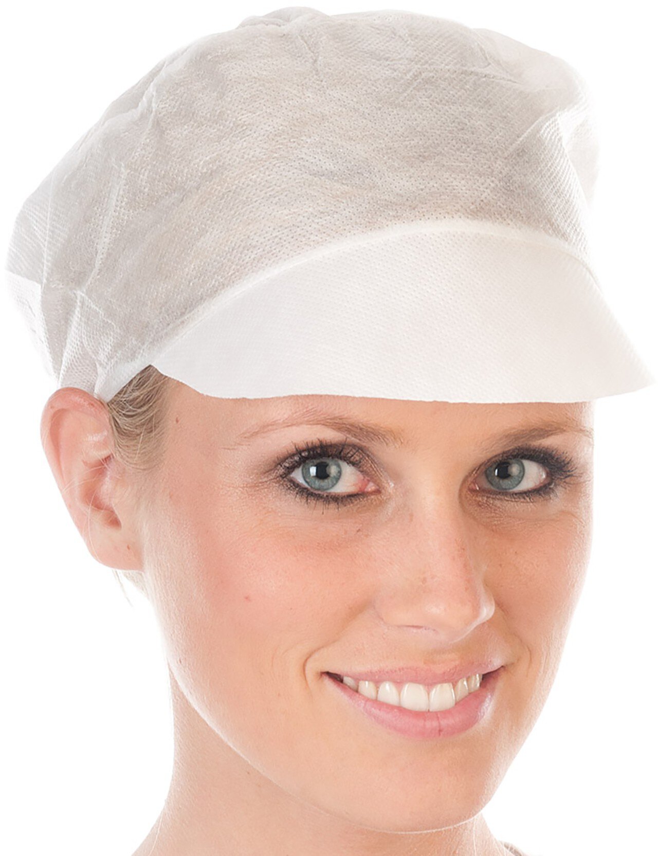 Die Schildmütze besteht aus Polypropylen von fester Qualität. Sie ist sehr leicht und luftdurchlässig. Diese Schildmütze wird vor allem in der Fleisch- und Lebensmittelindustrie verwendet. Alle Einweghauben haben latexfreie Gummibänder!