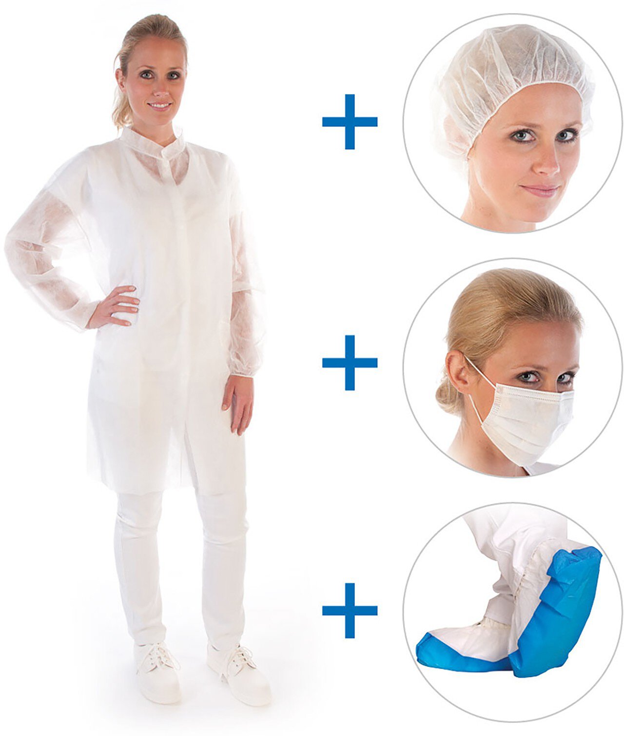 1 PP-Besucherkittel (2732) 1 Baretthaube (12649) 1 Mundschutz (2910) 1 Paar PE Überschuhe (2850)