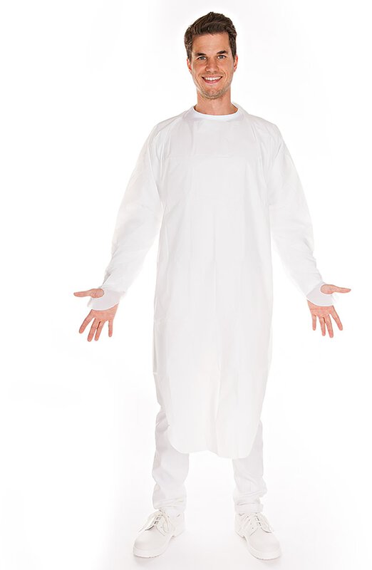 Noch ein Vorteil: Der Kittel besteht aus hochwertigem CPE (Cast Polyethylen). Dieses Material ist absolut flüssigkeitsdicht .