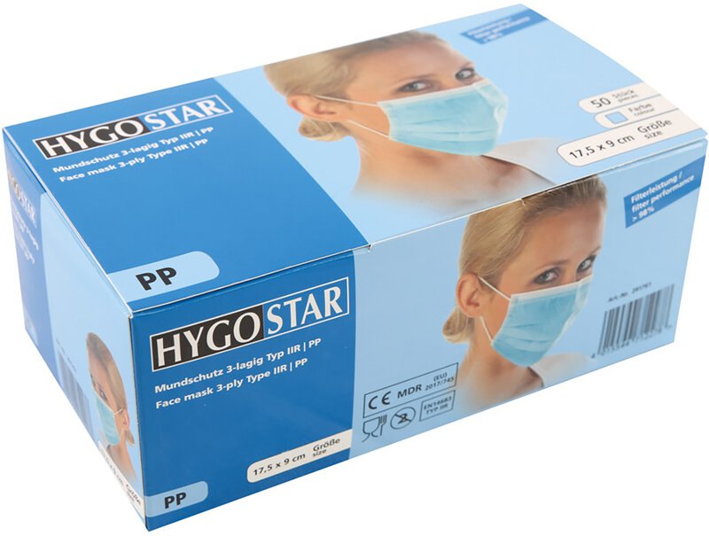 Mundschutz aus PP Typ IIR von Hygostar: Dieser 3-lagige Mundschutz erfüllt den Typ IIR. Das bedeutet: Die Gesichtsmaske ist resistent gegen Flüssigkeiten und Blut. Darüber hinaus erreicht der Mundschutz eine ausgezeichnete Filterleistung von bis zu 99 % (BFE).