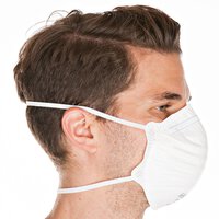 Die Atemschutzmaske FFP1 NR wird aus weißem Polypropylen angefertigt. Diese Maske verfügt über zwei Kopfbänder, einen biegsamen Nasenbügel sowie ein weiches Nasenkissen, wodurch ein guter Sitz und ein hoher Tragekomfort erreicht wird. Darüber hinaus ist die Atemschutzmaske FFP1 NR sehr haltbar. Bei dieser Maske handelt es sich um eine ergonomische Feinstaubmaske, die gut vor groben, gesundheitsgefährdenden trockenen Partikeln und Aerosolen (z. B. Holzschleifstäube, Quarzstaub, gröbere Allergene, Pollen) schützt.