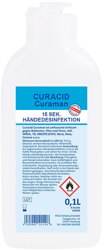 Alkoholische Händedesinfektion Curacid® Curaman Die alkoholische Händedesinfektion Curacid® Curaman ist eine vollviruzide Händedesinfetkion und daher hochwirksam. Es ist ideal für die hygienische und chirugische Hände-Desinfektion in Krankenhaus und Lebensmittelindustrie und schützt hochwirksam gegen Bakterien, Pilze, behüllte und unbehüllte Viren, inkl. MRSA, TB, HBV/HCV/HIV, Rota, Noro, Corona u.v.a.. Zur Anwendung auf die trockenen Hände vor, nach oder zwischen verschiedenen Arbeitsschritten auftragen, speziell beim Umgang mit Biostoffen oder Lebensmitteln. Wichtig hierbei ist, dass eine ausreichende Menge aufgetragen wird, damit die Hände vollständig benetzt sind. Eigenschaften der alkoholischen Händedesinfektion Curacid® Curaman im Überblick: