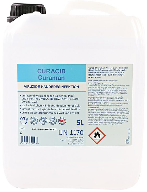 Alkoholische Händedesinfektion Curacid® Curaman Die alkoholische Händedesinfektion Curacid® Curaman ist eine vollviruzide Händedesinfetkion und daher hochwirksam. Es ist ideal für die hygienische und chirugische Hände-Desinfektion in Krankenhaus und Lebensmittelindustrie und schützt hochwirksam gegen Bakterien, Pilze, behüllte und unbehüllte Viren, inkl. MRSA, TB, HBV/HCV/HIV, Rota, Noro, Corona u.v.a.. Zur Anwendung auf die trockenen Hände vor, nach oder zwischen verschiedenen Arbeitsschritten auftragen, speziell beim Umgang mit Biostoffen oder Lebensmitteln. Wichtig hierbei ist, dass eine ausreichende Menge aufgetragen wird, damit die Hände vollständig benetzt sind. Eigenschaften der alkoholischen Händedesinfektion Curacid® Curaman im Überblick: