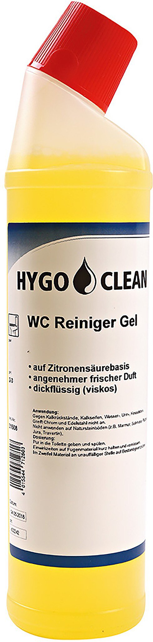 WC-Reiniger Gel Zitrus von HygoClean Das WC-Reiniger Gel wirkt kraftvoll gegen Kalkrückstände, Kalkseifen sowie Wasser-, Urin- und Kesselstein. Der auf Zitronensäure basierende, dickflüssige Reiniger kann auch verdünnt für Chrom und Edelstahl eingesetzt werden (nicht für Natursteinböden geeignet). Zudem verteilt er einen angenehm frischen zitronigen Duft. Zusatzinfo: Made in Germany | ph-Wert: 2-3