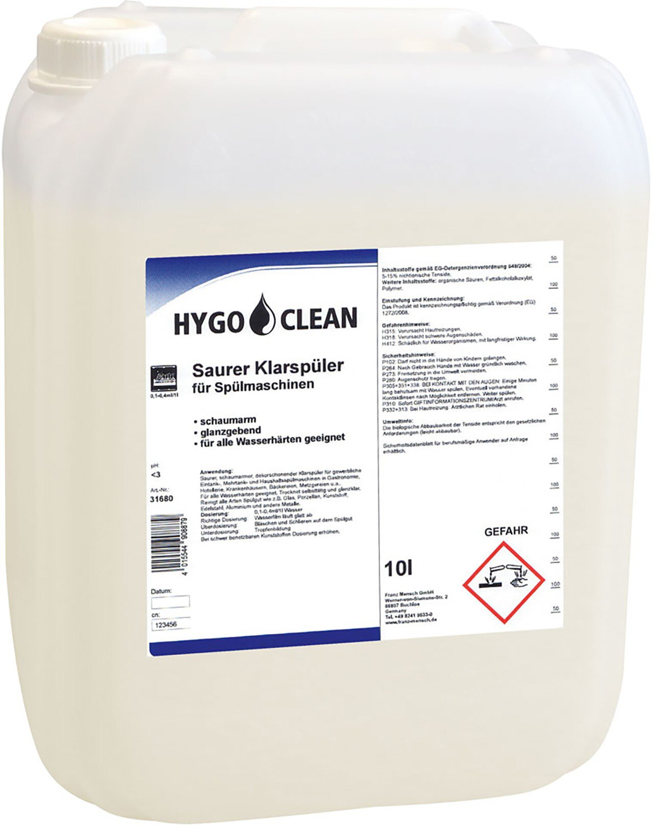 Saurer Klarspüler für Spülmaschinen von HygoClean Mit dem sauren Klarspüler von HygoClean verleihen Sie Ihrem Geschirr einen sauberen Glanz. Auch bei Glas, Porzellan, Kunststoff, Edelstahl oder Aluminium. Der Reiniger ist für alle Wasserhärten geeignet.