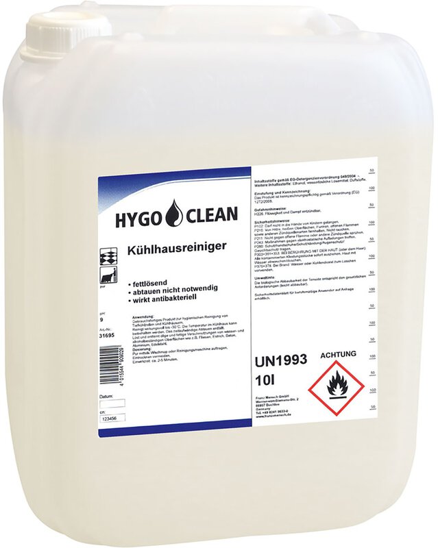 Kühlhausreiniger von HygoClean Der Kühlhausreiniger eignet sich für Temperaturen bis zu -3°C und erspart zeitaufwändiges Abtauen. Er verfügt unter anderem über eine fettlösende und antibakterielle Wirkung und kann ganz einfach mit dem Wischmop oder der Reinigungsmaschine aufgetragen werden.