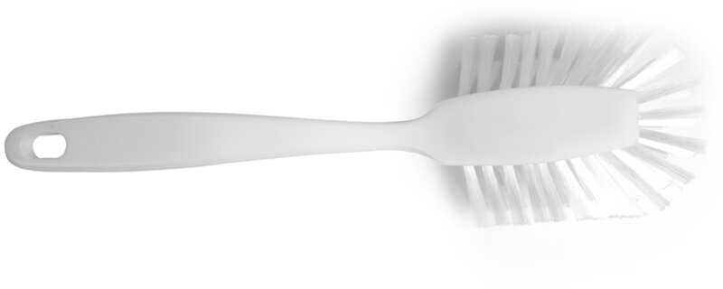 Die Spülbürste besteht aus mittel-harten HACCP-Fasern. Sie besitzt einen Stiel und der Kopf hat eine halbrunde Form.