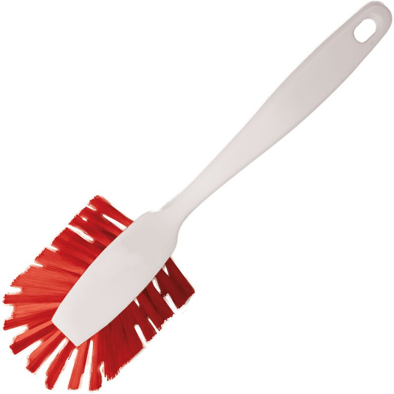 Die Spülbürste besteht aus mittel-harten HACCP-Fasern. Sie besitzt einen Stiel und der Kopf hat eine halbrunde Form.