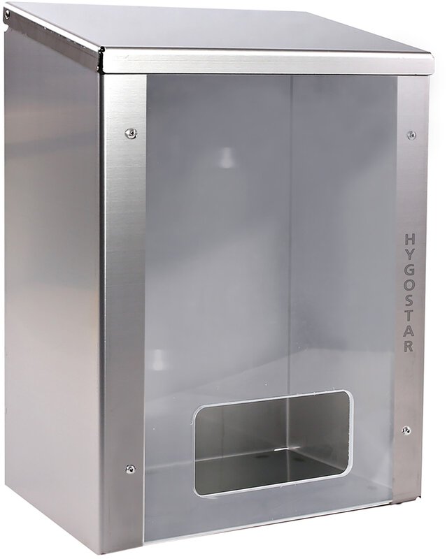 Der Multispender für Hauben, Schutzärmel, Überschuhe ist aus rostfreiem Edelstahl mit einer durchsichtigen Front aus Plexiglas. Der Deckel kann zum Befüllen geöffnet werden.