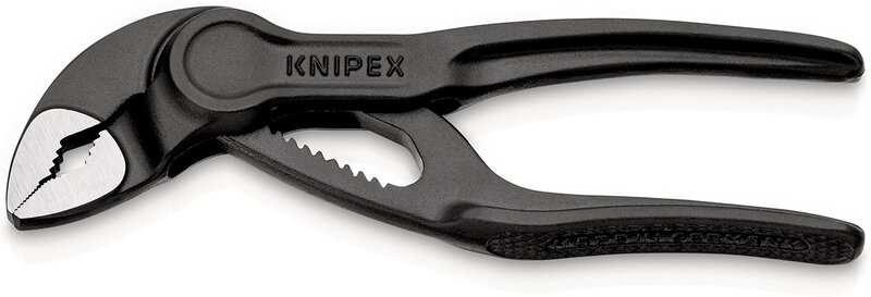 KNIPEX Cobra® XS Optimale Zugänglichkeit bei engsten Platzverhältnissen: besonders kompakte Bauform, sehr schlanker Kopf. Einhändige Feinverstellung für die einfachste Anpassung an verschiedene Werkstückgrößen durch Anschieben. Dauerhaft sicheres Greifen durch hohe Verschleißfestigkeit. Greifkapazität Ø 28 mm, Schlüsselweite bis 24 mm – bei nur 100 mm Länge. Durchgestecktes Gelenk: hohe Stabilität und Belastbarkeit durch doppelte Führung. Greifflächen mit spezialgehärteten Zähnen, Härte der Zähne ca. 60 HRC. Selbstklemmend an Rohren und Muttern: kein Abrutschen am Werkstück, kraftsparendes Arbeiten. Klemmschutz verhindert Quetschverletzungen. Feinverstellung mit 11 Einstellpositionen. - Einstellpositionen: 11 - Kapazität für Muttern, Schlüsselweite (Zoll): Ø 1 in - Kapazität für Muttern, Schlüsselweite (mm): 24mm - Kapazität für Rohre (Durchmesser): Ø 28mm