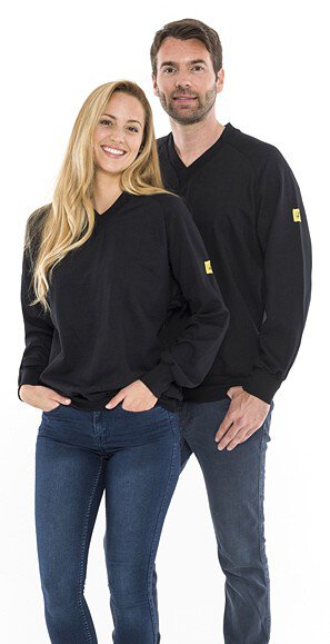 Das ESD Sweatshirt von Safeguard mit runden Halsausschnitt in der Farbe schwarz besteht aus 48% Baumwolle, 48% Polyester und 4% Karbonfaser und hat ein Flächengewicht von 280 g/m². Diese ESD leidung ist speziell für Arbeiten in ESD Zonen (EPA) entwickelt worden, um Schäden durch elektrostatische Entladungen an sensiblen elektronischen Bauteilen zu verhindern.