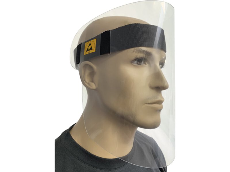 Dieser ESD-Gesichtsschutz wird mit einem Stirnband mit Klettverschluß am Kopf fixiert.