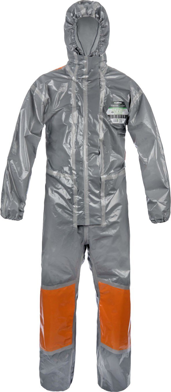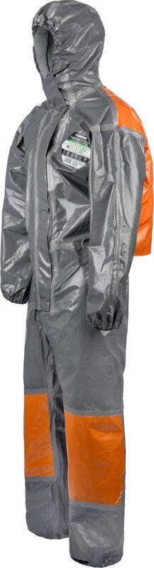 Polymerbeschichteter Chemikalienschutzanzug, Kapuze mit Gesichtsgummi, dichter Maskenabschluss, Gummizug an Arm- und Beinenden, heißüberklebte Nähte, verklebbare, doppelte Reissverschlussabdeckung, mit separatem, atmungsaktivem Rückenteil mit oben und seitlich versiegelter Klappe, ermöglicht die Luftzirkulation im Anzug, gepolsterte, doppellagige Knieschützer, Barriere gegen eine Vielzahl gefährlicher Chemikalien sowie biologischen Gefahrstoffen, innenseitig antistatisch, CE CAT.III, Typ 4,5+6, spray-, staub- und begrenzt spritzdicht, Schutz vor radioaktiven Partikeln gem. EN 1073-2, EN 14126 - Schutz vor Infektionserregern (4B)
